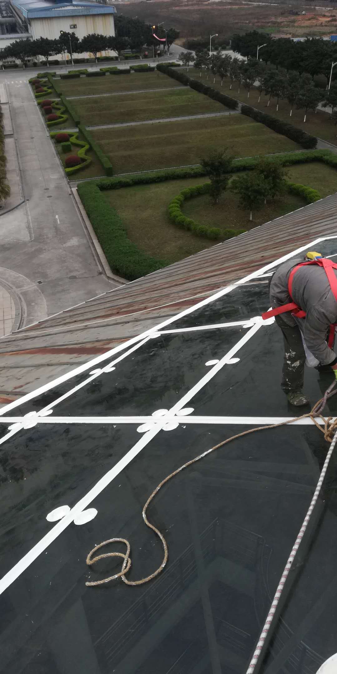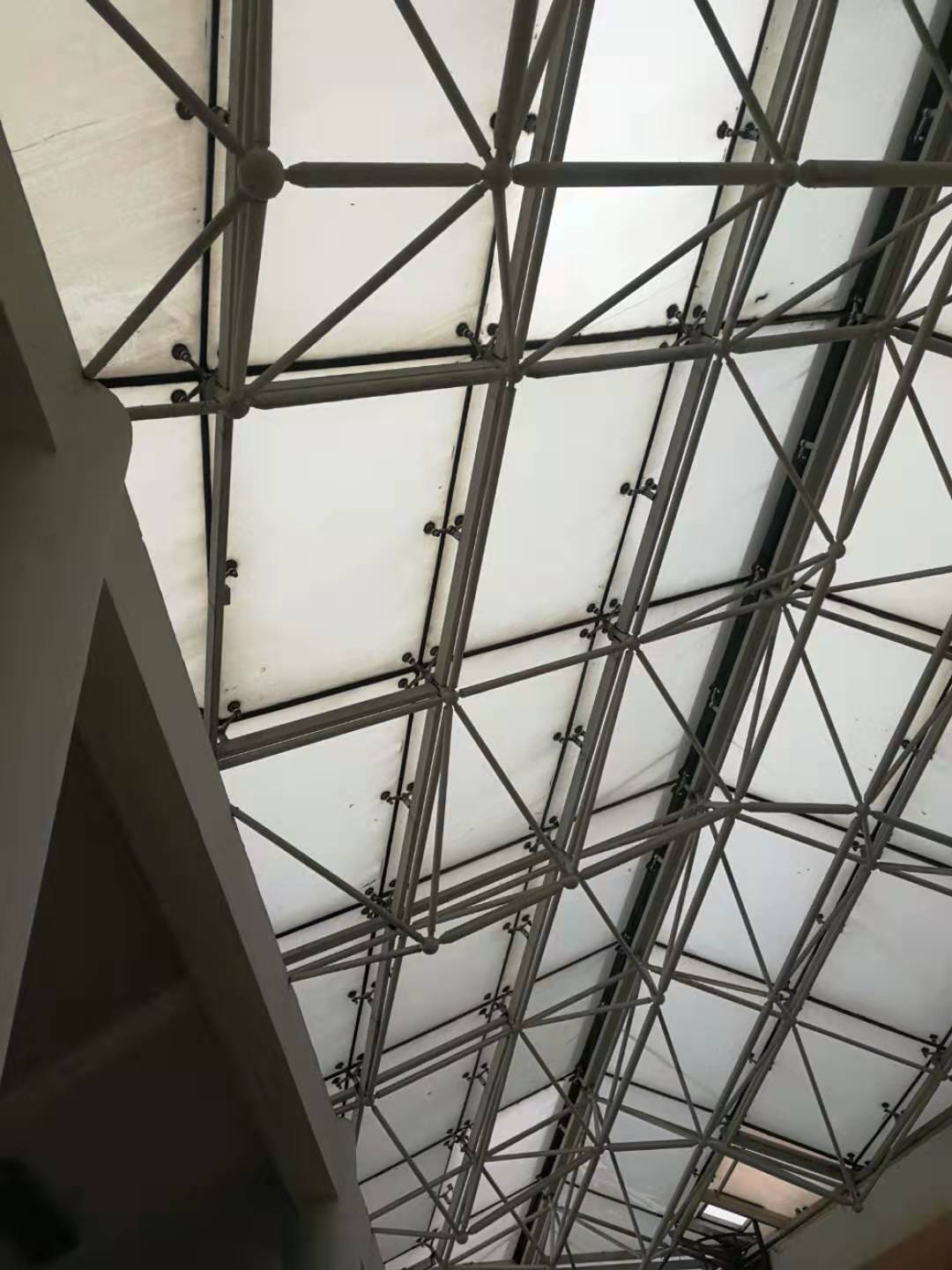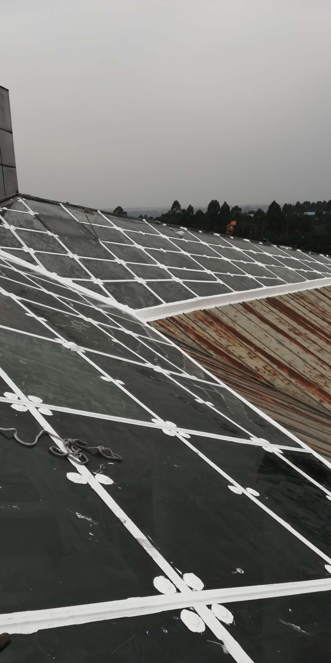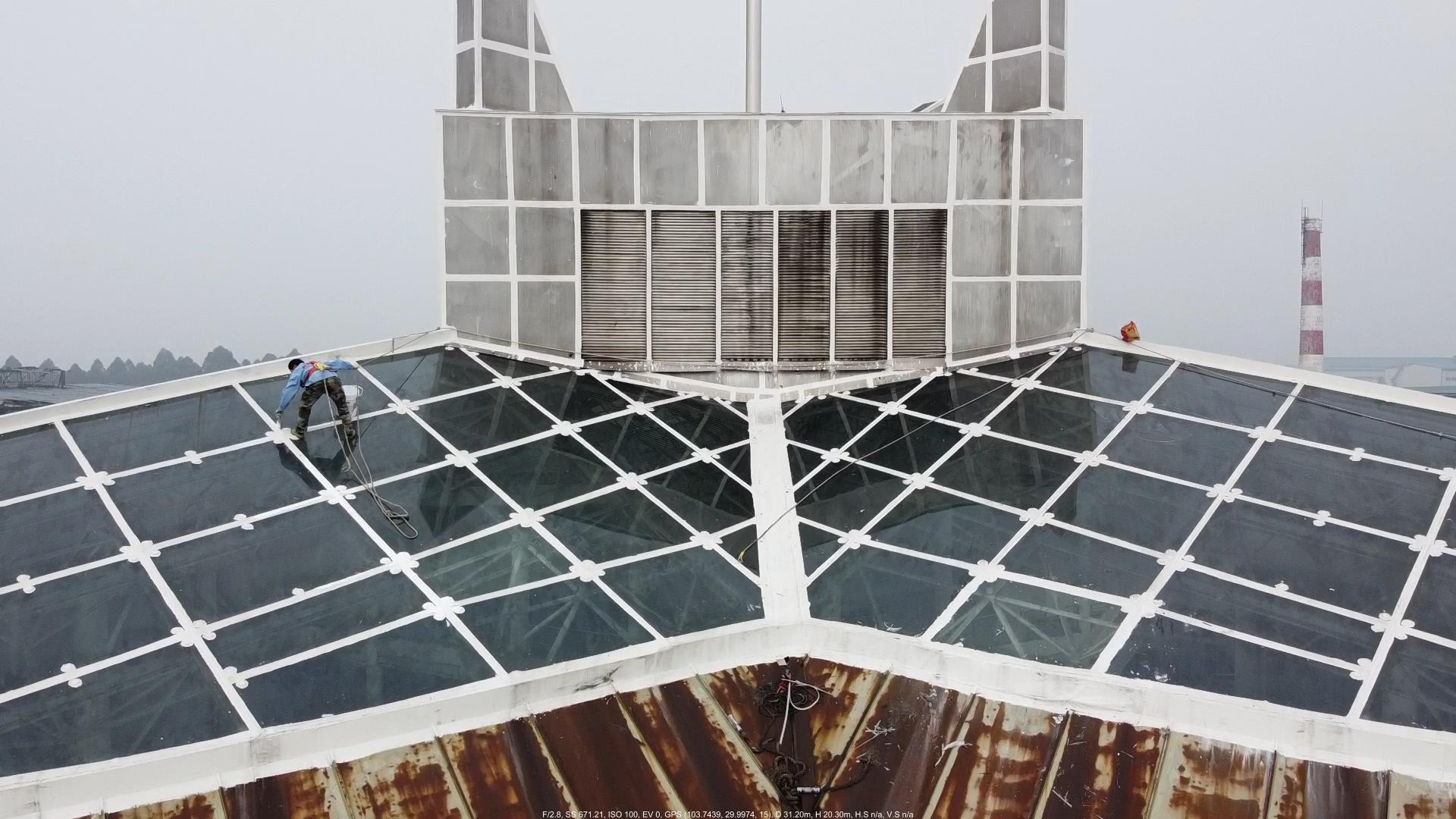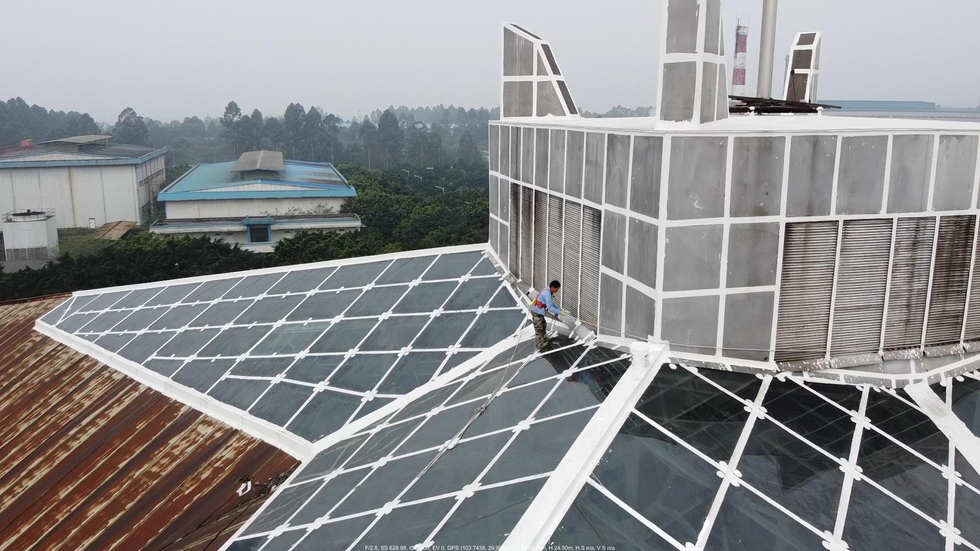 本公司承接的四川啟明星鋁業有限責任公司綜合辦公樓玻璃屋面防水工程,啟明星鋁業坐落于眉山市東坡區甘眉工業園區,廠區內的綜合辦公樓頂部中間區域為玻璃屋面,之前玻璃屋面下雨的時候漏水點位較多,基本上可以說是外面下大雨室內下小雨,甲方也安排了人員對玻璃頂的玻璃接縫進行重新打膠處理,但是管不了不久又開始漏水,后來甲方經過多方面分析最終決定采納我公司的方案進行防水施工處理。
