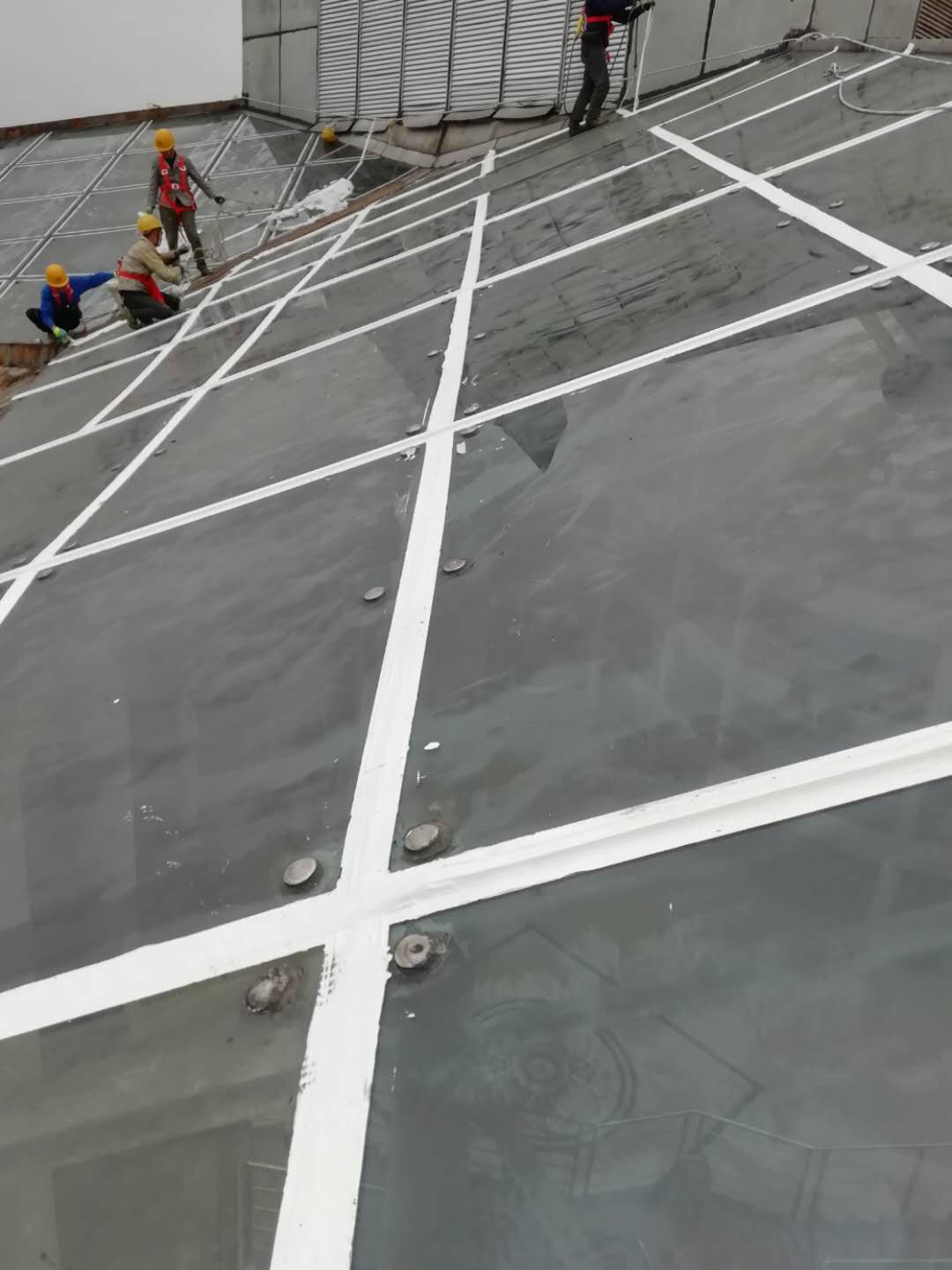 我公司采取的施工方法是,采用SYR金屬屋面專用防水涂料配合我們的專用縫織聚酯布,先將玻璃頂表面清理干凈,然后涂刷一遍防水涂料、鋪貼專用聚酯布、再涂刷第二遍防水涂料,待干后再涂刷一遍防水涂料,最終將施工工作面清理干凈。