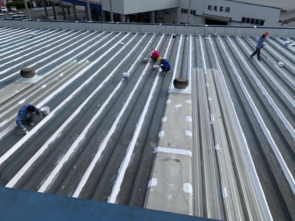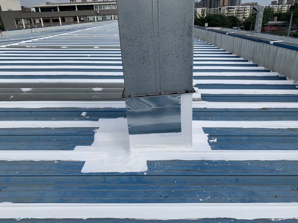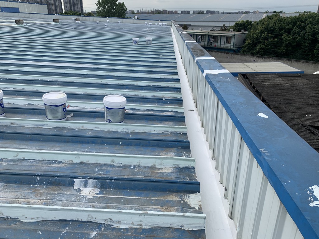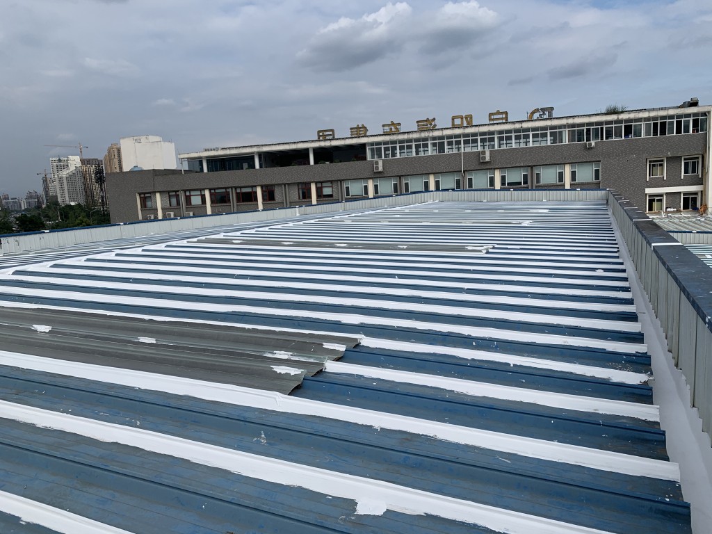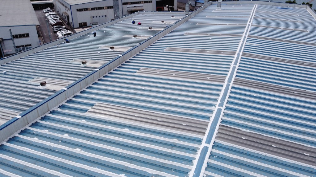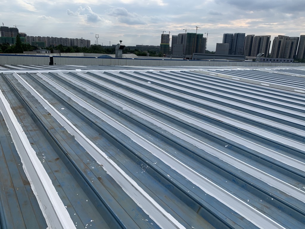 我公司采用的SYR金屬屋面專用防水涂料配合專用縫織聚酯布一布三涂形成的SYR金屬屋面專用防水系統具有防水、防腐、抗紫外線、反射隔熱的效果,特別適合于暴露屋面的使用,耐久性佳。