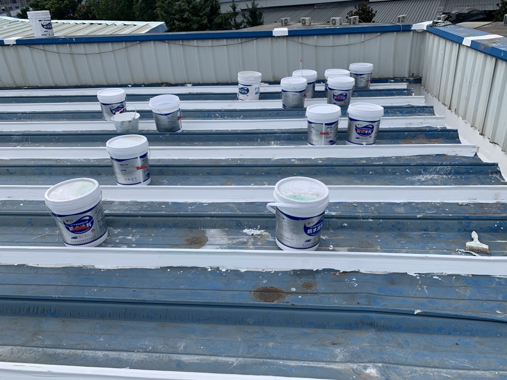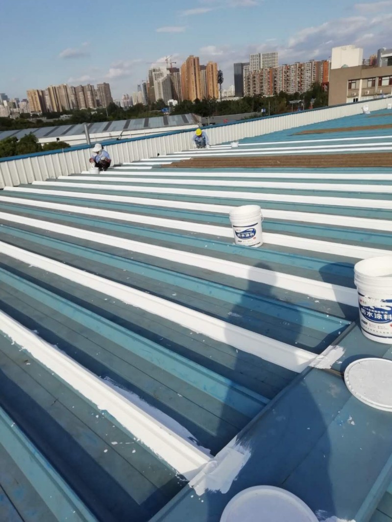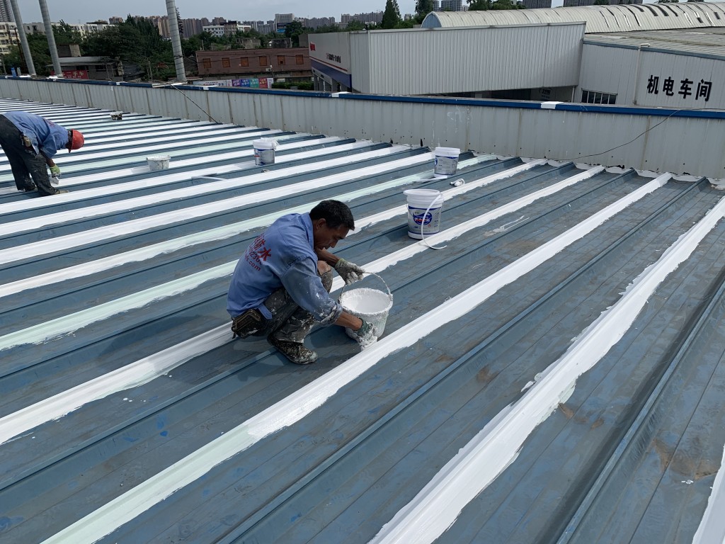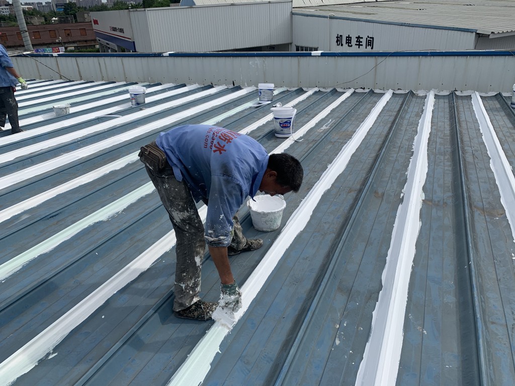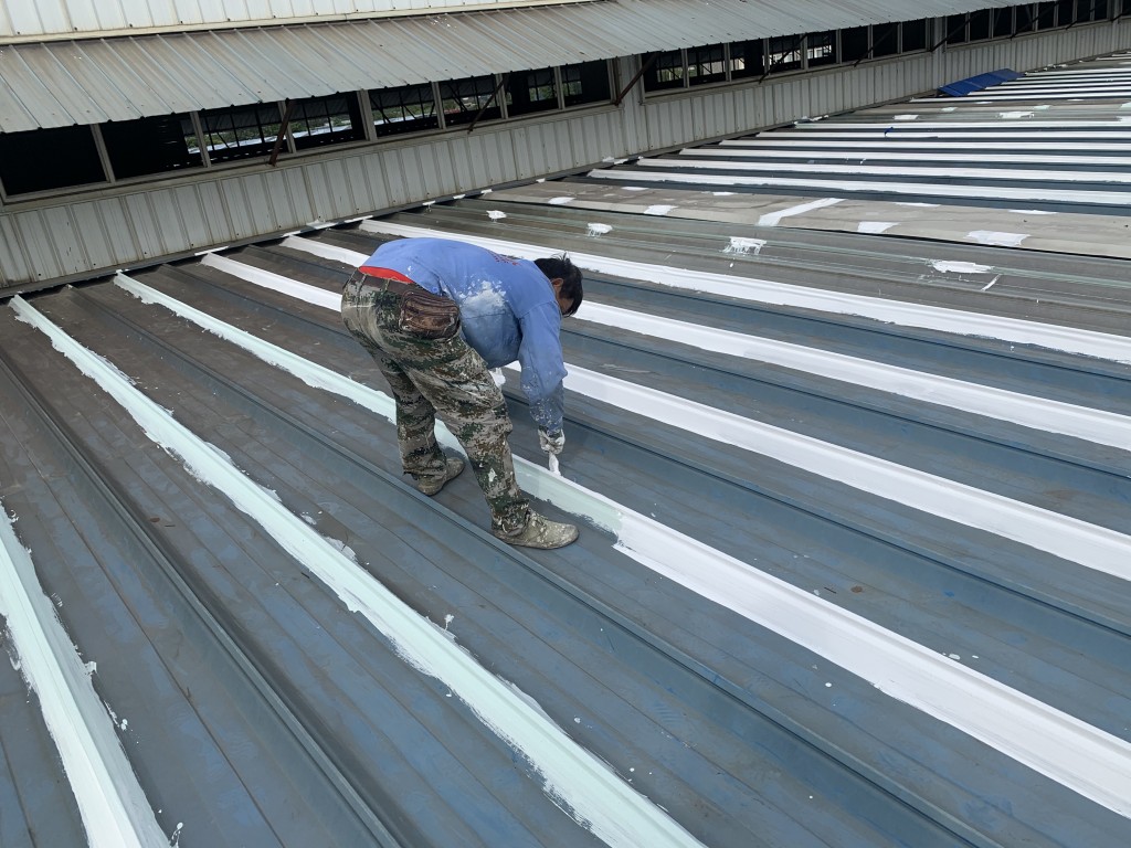 我公司采用的SYR金屬屋面專用防水涂料配合專用縫織聚酯布一布三涂形成的SYR金屬屋面專用防水系統具有防水、防腐、抗紫外線、反射隔熱的效果,特別適合于暴露屋面的使用,耐久性佳。