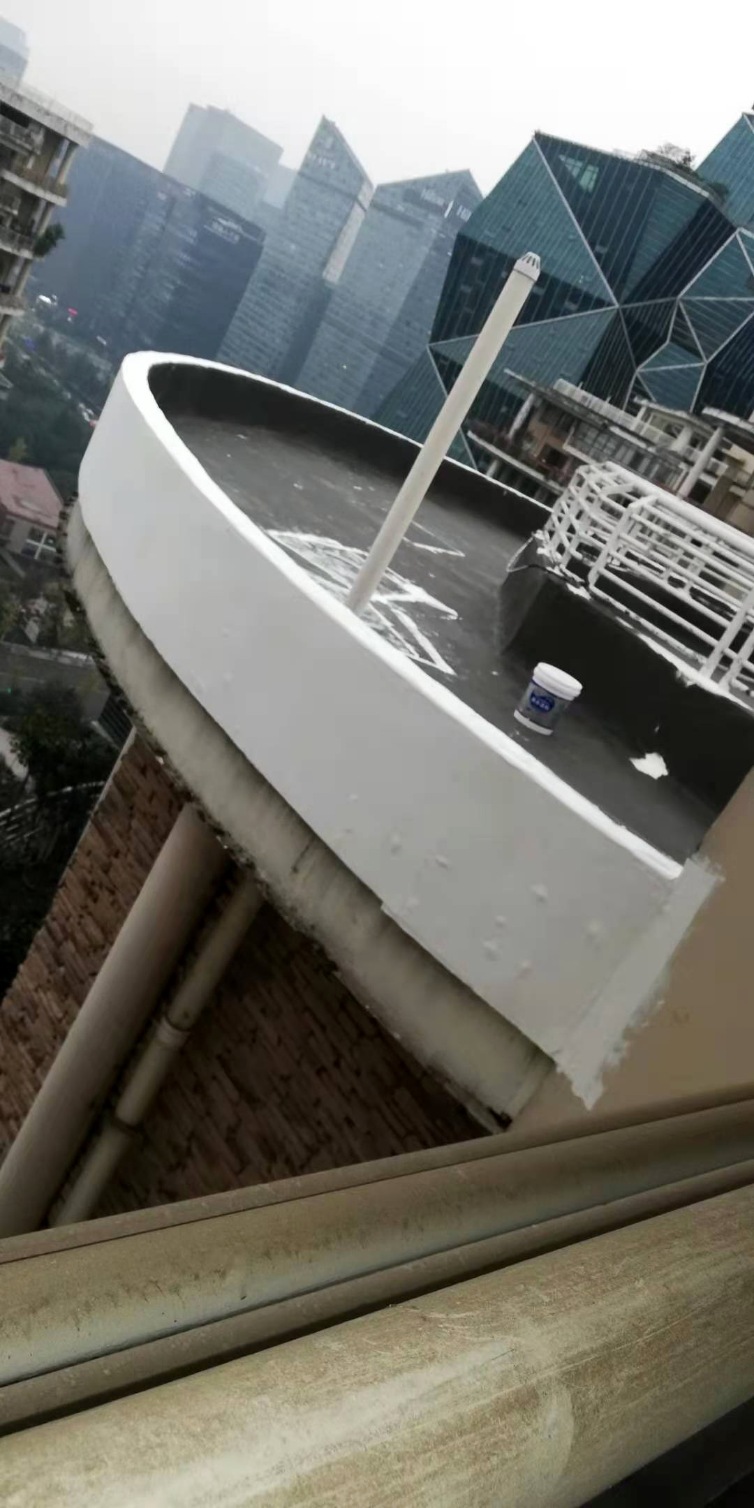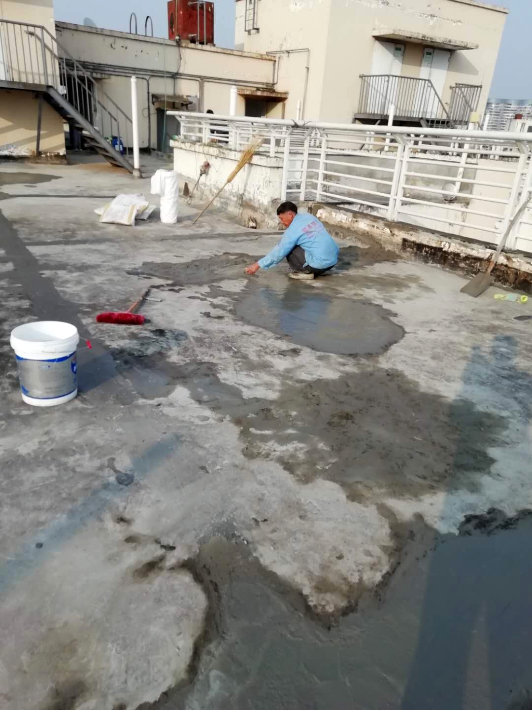 成都市天府大道天鵝湖花園2棟與10棟屋頂存在漏水的現象,經過我公司技術人員到達現場查勘情況,為屋頂原防水層有破損漏水問題,并且屋頂的原保護層也有很多翻砂起殼根據現場實際情況,我公司根據現場實際情況制定的方案為,將屋頂表面已破損的砂漿保護層進行修補處理,先采用聚合物水泥防水涂料配合防水專用縫織聚酯布對基層表面裂縫進行加強處理,然后整個屋面采用蜀禹公司的國標I型聚合物水泥防水涂料配合防水專用縫織聚酯布一布三涂方式進行防水施工,待干后表面再涂刷SYR金屬屋面專用防水涂料,最后表面再涂刷蜀禹透明高分子防水液罩面層。