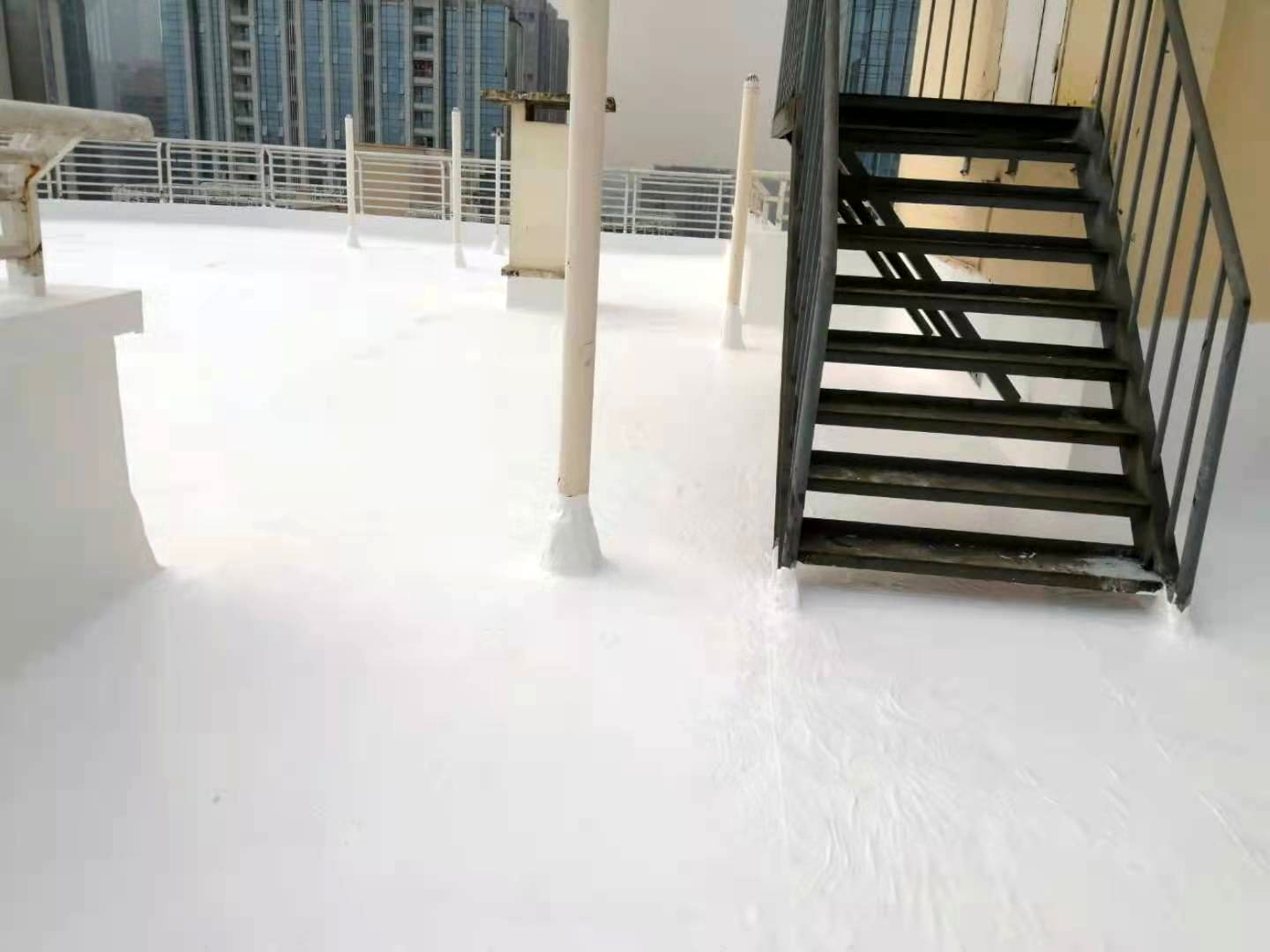 此施工工藝施工后,表面的SYR金屬屋面專用防水涂料配合高分子透明罩面層一起具有防紫外線、抗老化、隔熱降溫等功效,防水層施工后屋面無需再做水泥砂漿保護層依然可保持屋頂防水層的使用年限,夏季頂樓住戶室內降低溫度效果明顯,最高降溫可達15℃以上。