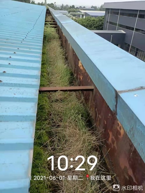 四川啟明星鋁業有限責任公司原鋸切車間下雨時屋頂漏雨嚴重,廠房內靠墻部位、中間彩鋼接縫部位等漏水點位較多,并且漏雨量較大,我公司技術人員到現場勘察,是由于屋頂的彩鋼頂彩鋼接縫等部位下雨時漏雨,天溝內也淤泥較多并且天溝已經存在銹蝕的情況.