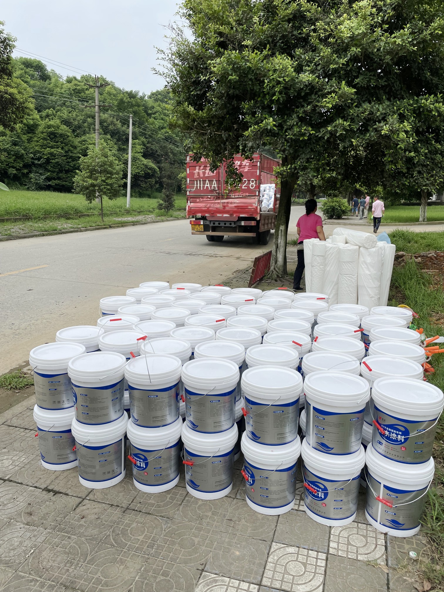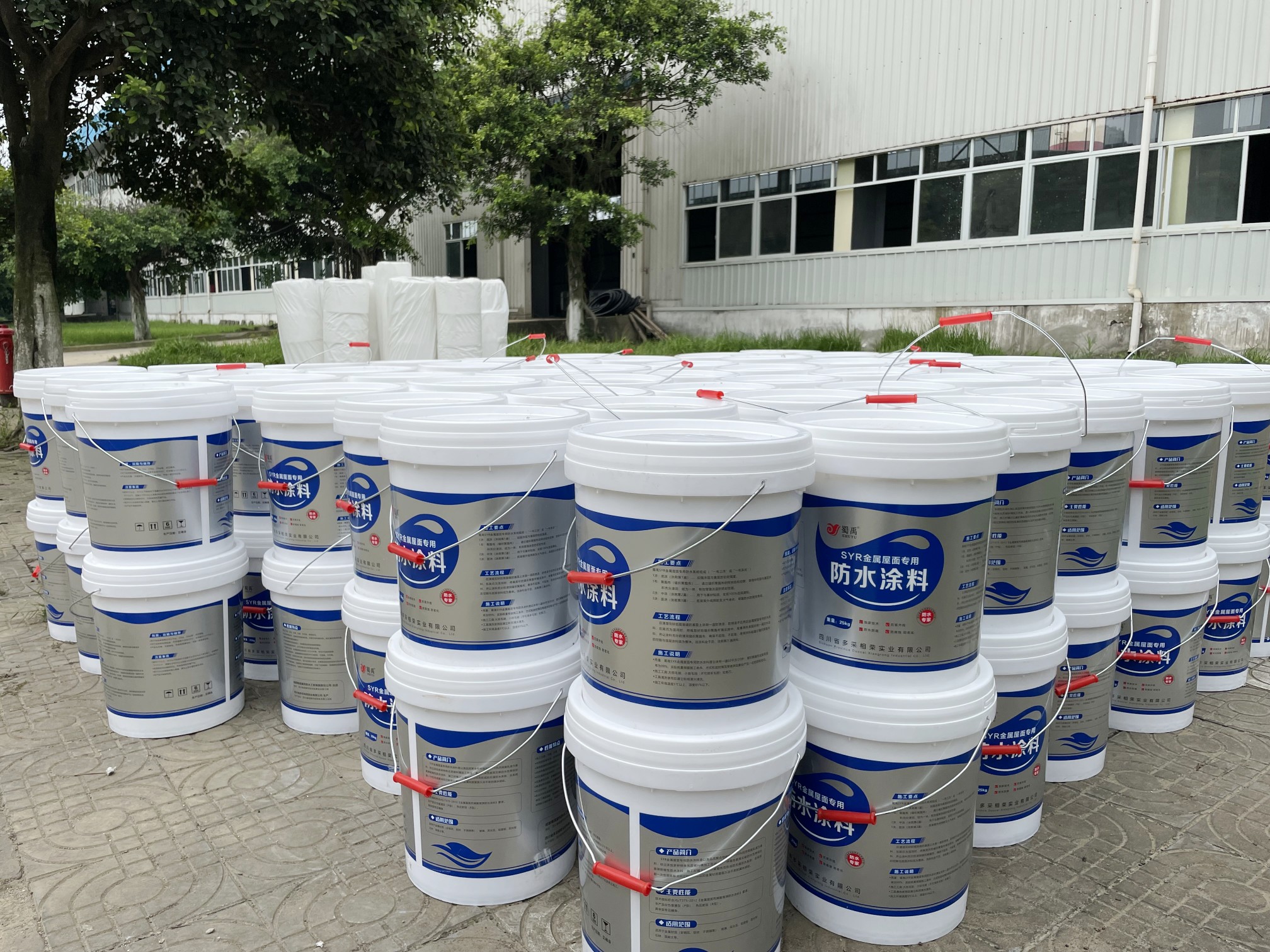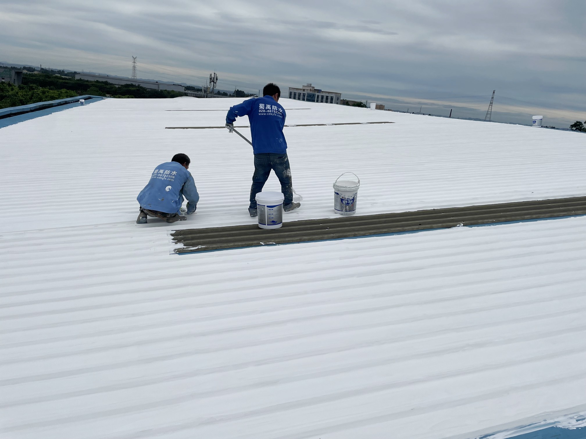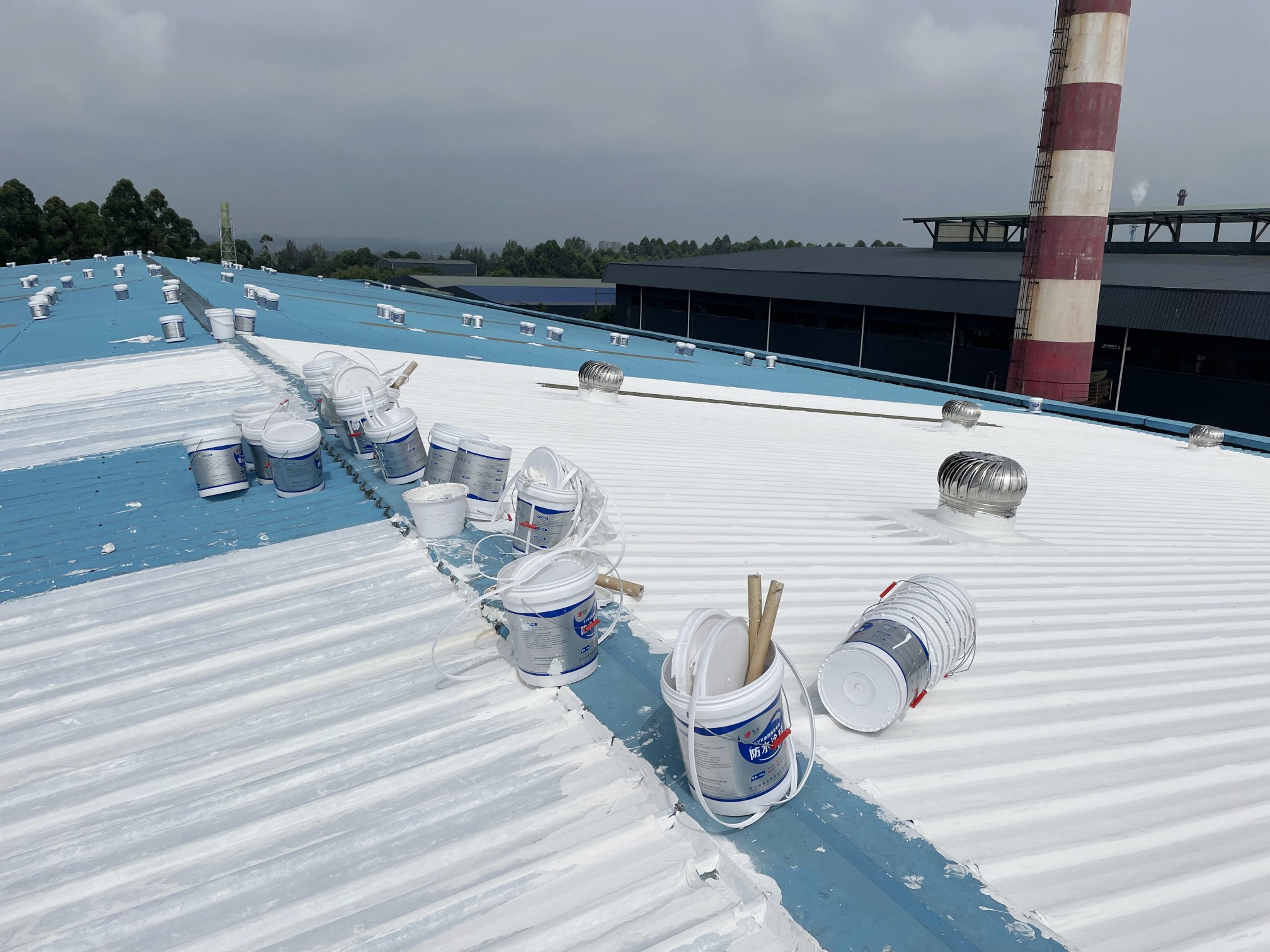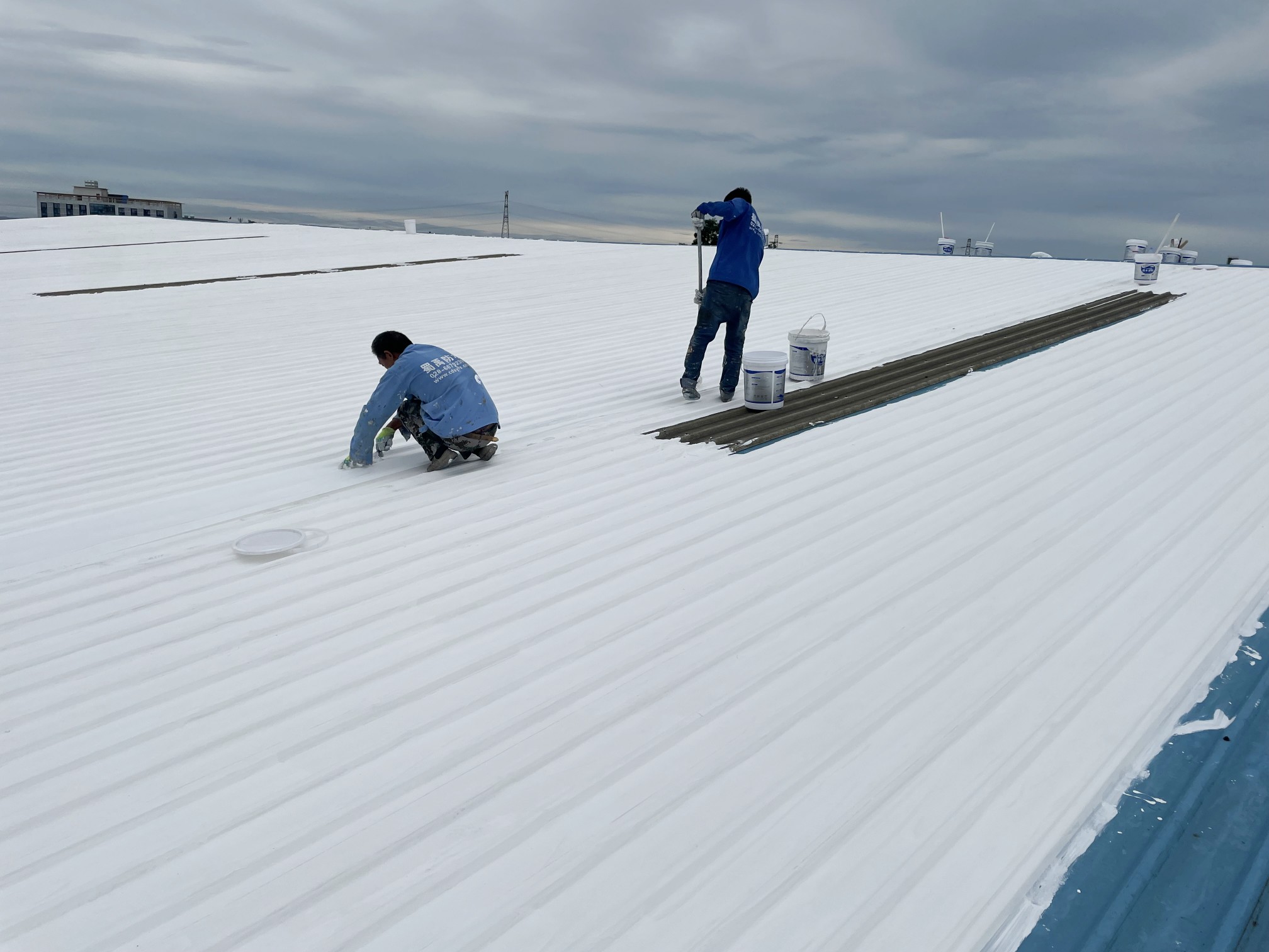 我公司根據現場實際情況,制定的方案是,采用SYR金屬屋面專用防水涂料配合專用的縫織聚酯布,涂刷多遍SYR金屬屋面專用防水涂料并中間鋪設聚酯布的方式進行防水施工,采用此工藝施工的防水工程是專門針對彩鋼頂的外露型屋頂的方式,SYR金屬屋面專用方式涂料施工后具有防水、反射隔熱降溫、耐酸性腐蝕、耐氣候老化多種功能。表面無需做保護層依然可確保防水層的耐久使用壽命。