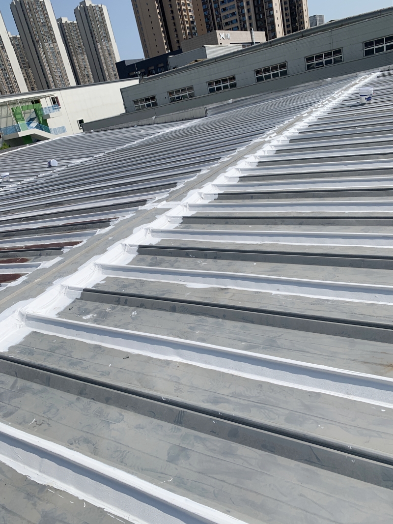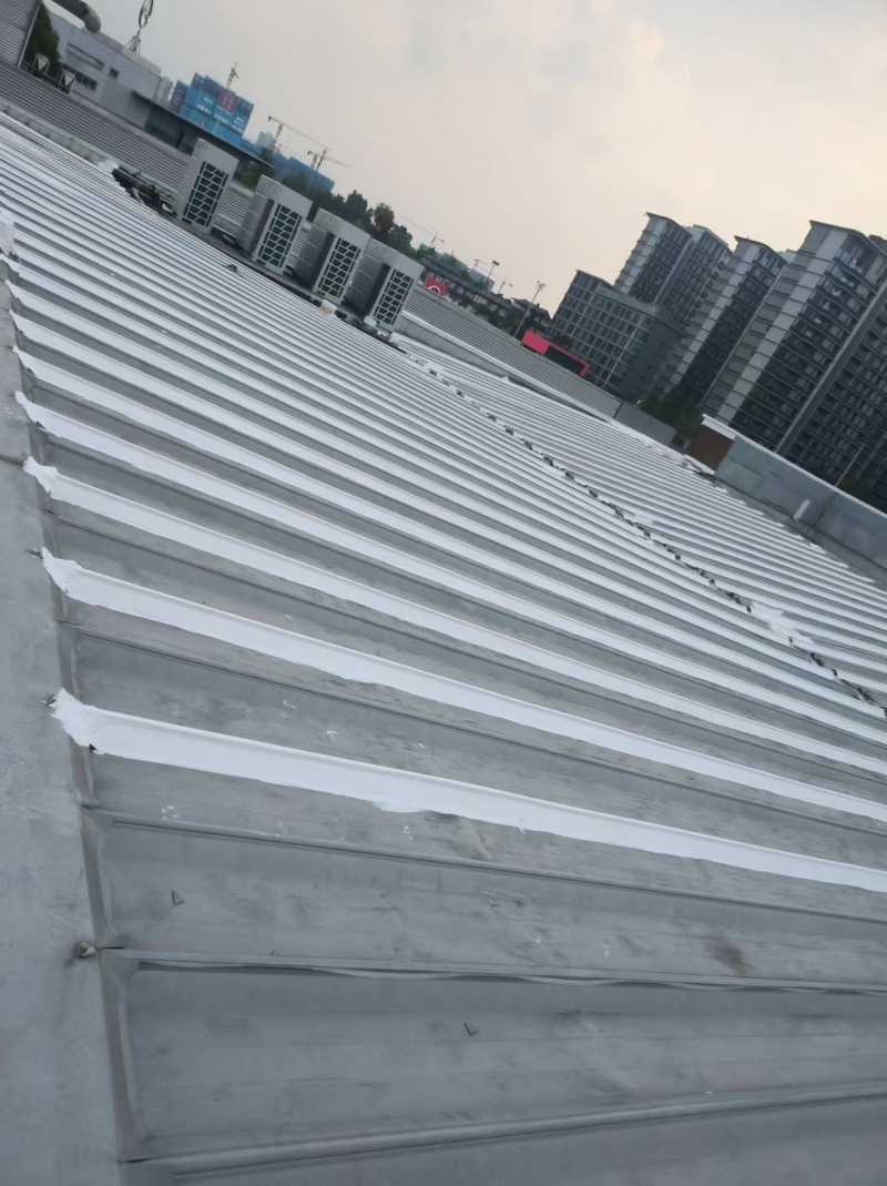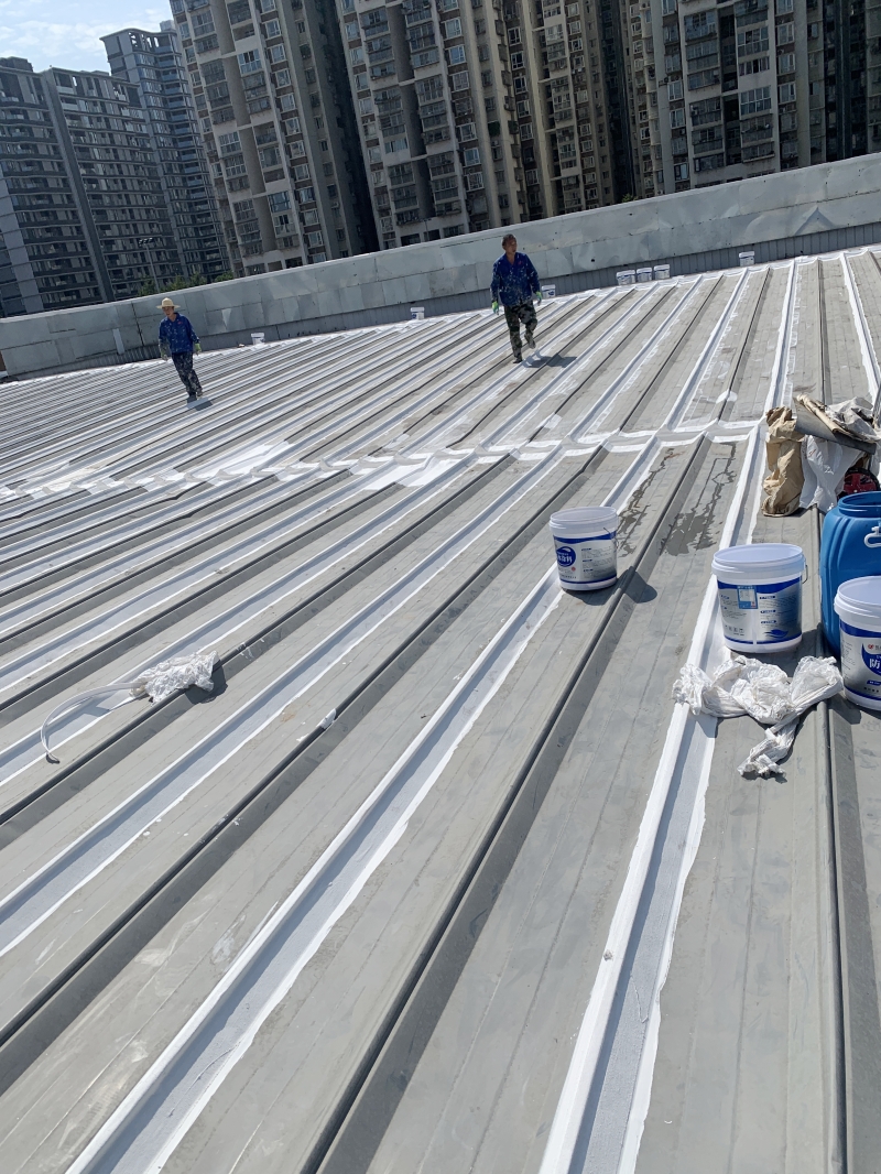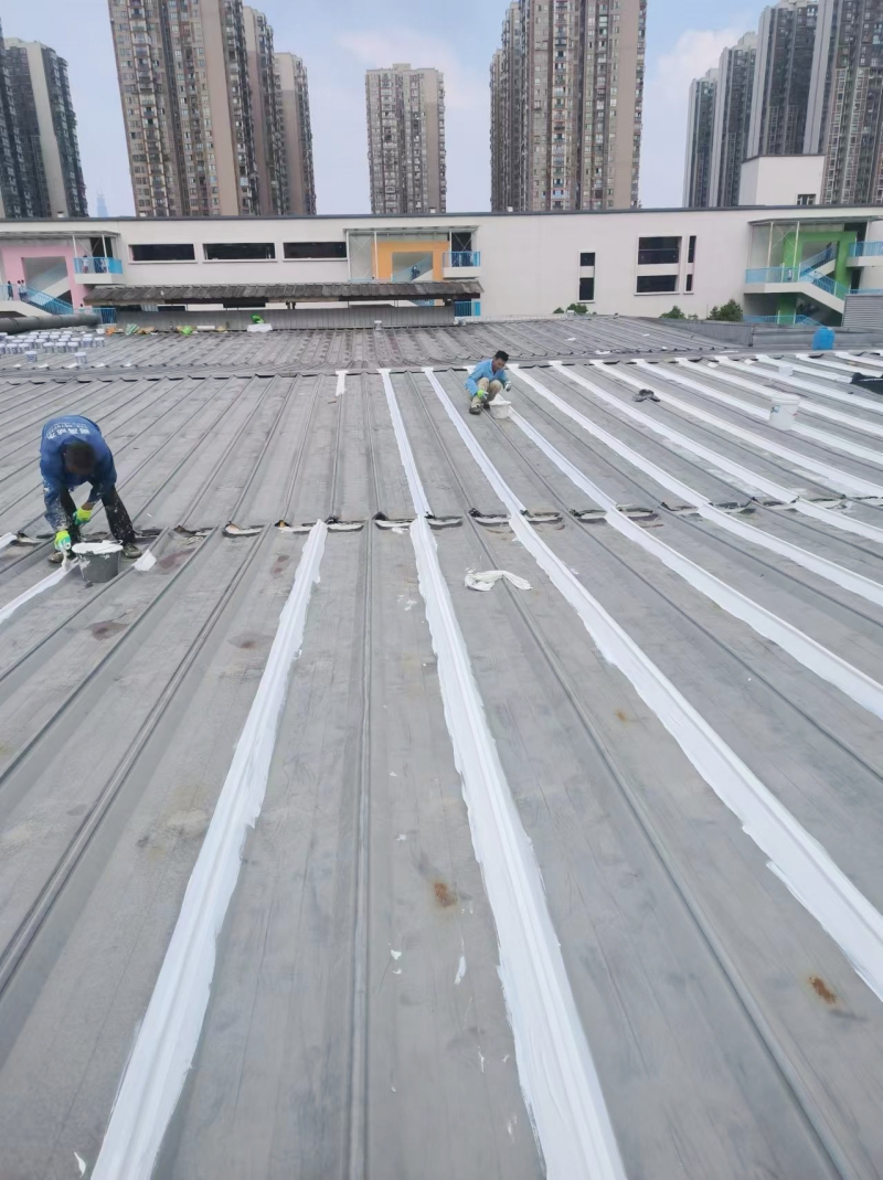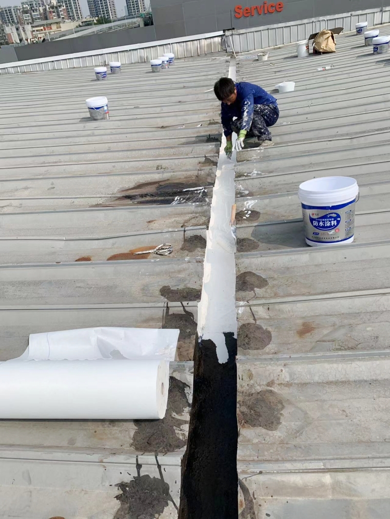 在施工過程中,蜀禹防水公司的專業團隊首先對彩鋼頂表面的彩鋼瓦搭接縫、固定螺釘以及天溝等關鍵部位進行了重點處理。他們采用SYR金屬屋面防水涂料配合縫織聚酯布進行防水補漏處理,這種材料具有優秀的防水性能和耐久性,能夠有效隔絕雨水對彩鋼頂的侵蝕。同時,縫織聚酯布的加入還增強了防水層的強度和韌性,提高了整體防水效果。