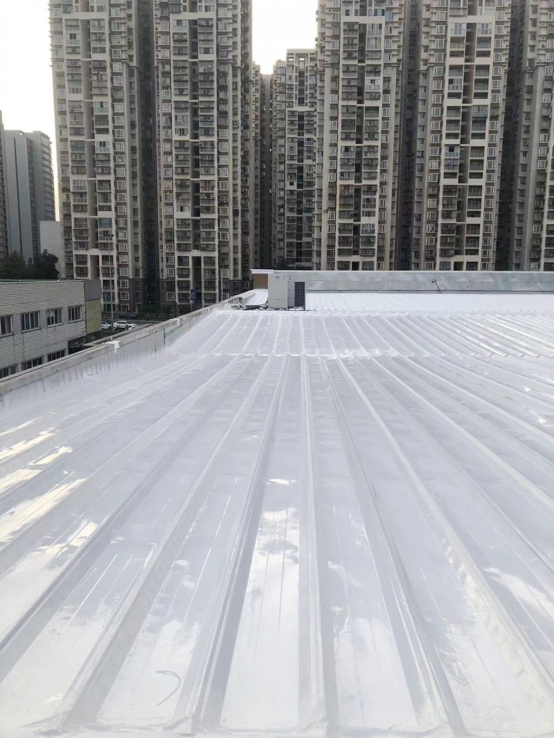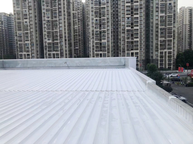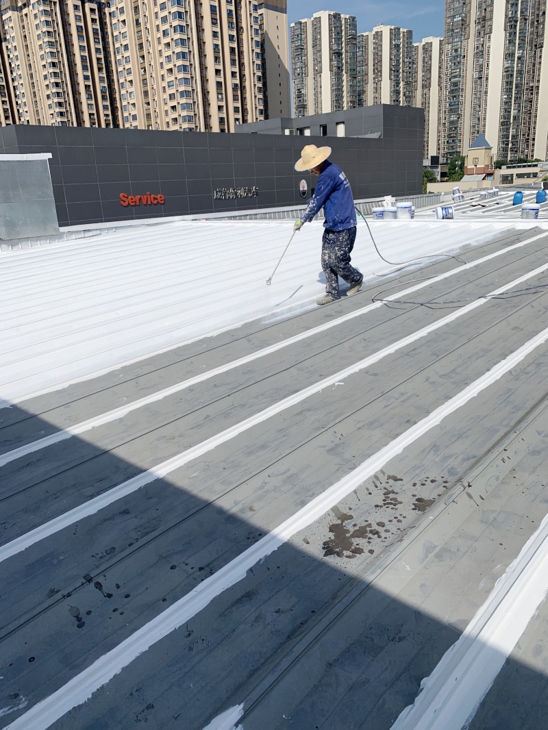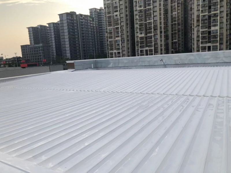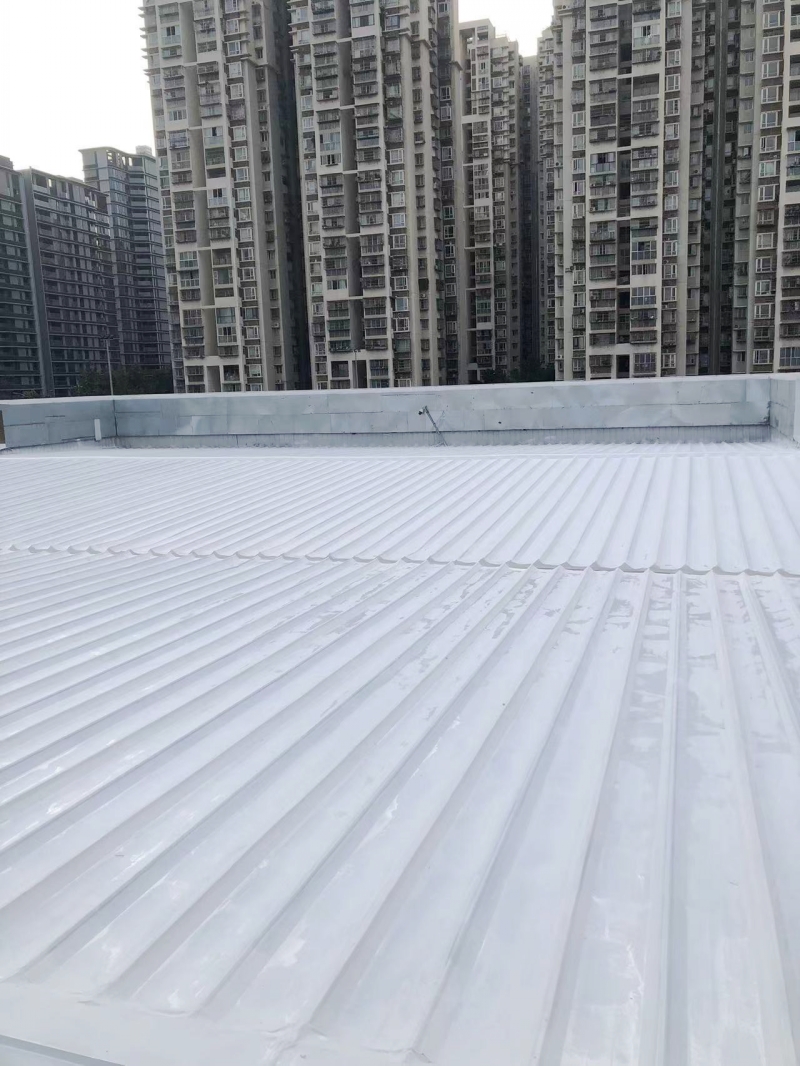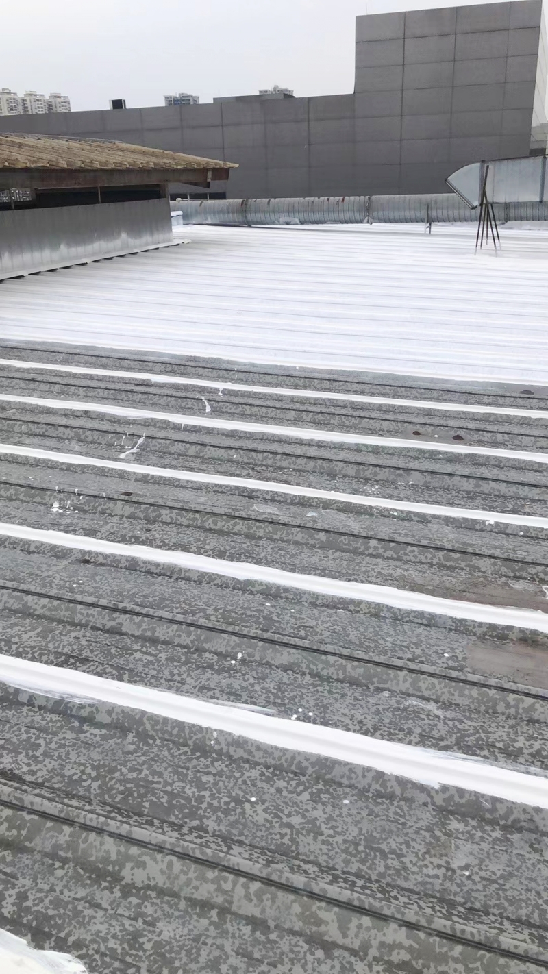 在完成關鍵部位的防水補漏處理后,蜀禹防水公司的團隊對整個彩鋼頂表面進行了滿噴涂SYR金屬屋面防水涂料的防腐翻新施工。這種涂料不僅具有良好的防水性能,還具有出色的防腐性能,能夠有效保護彩鋼瓦表面不受腐蝕和氧化的侵害。通過滿噴涂施工,彩鋼頂表面的涂層均勻、美觀,且具有較強的附著力和耐久性,能夠長期保持建筑的良好狀態。