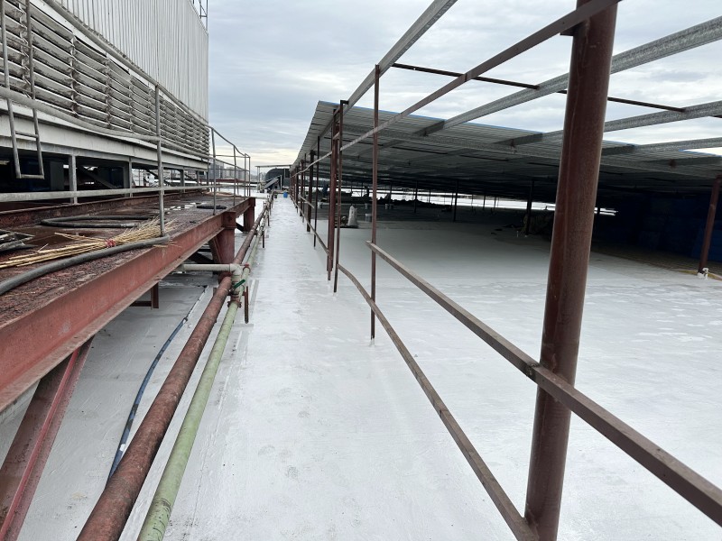 待防水層完全干燥后,施工團隊在表面又涂刷了SYR金屬屋面防水涂料。這種涂料不僅具有優秀的防水性能,還能夠耐受紫外線、風吹雨打等惡劣氣候條件的侵蝕,保護防水層不受損害。